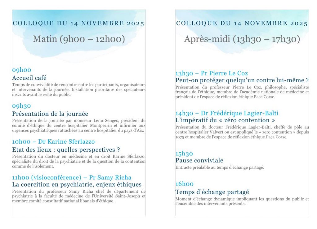 Conférences -Débat « Fin de vie : les enjeux éthiques autour du suicide assisté » en présence des Docteurs Jean-Marc LAPIANA et Jean-Marc HENRY : jeudi 6 novembre 2025 (14h-16h) suivi d’une conférence « L’éthique en soins palliatifs » par le Dr Julien MERRIEN