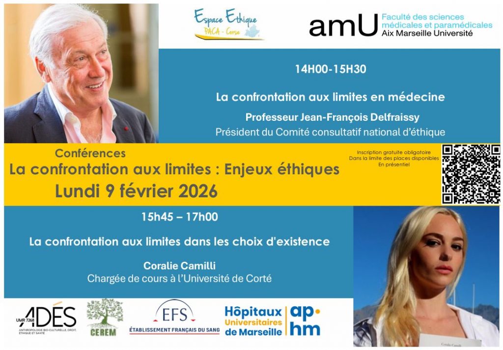 Conférence -Débat– Lundi 9 février de 14h à 17h « La confrontation aux limites . Enjeux éthiques » animé par le Pr Pierre LE COZ – Avec la présence exceptionnelle du Pr Jean-François DELFRAISSY, Président du CCNE et de Coralie CAMILLI, Philosophe.